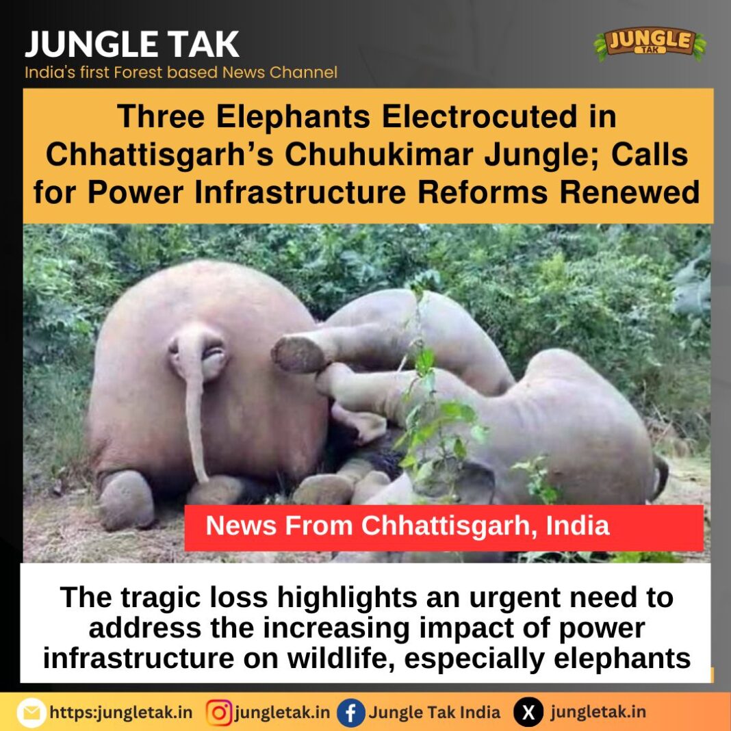 In a tragic incident, three elephants were electrocuted in the Chuhukimar jungle within the Garghoda Range of Chhattisgarh’s Raigad Division. The tragic loss highlights an urgent need to address the increasing impact of power infrastructure on wildlife, especially elephants. Over the past 20 years, electrocution has claimed the lives of 77 elephants in the state, underscoring the critical need for infrastructure reforms to ensure safer wildlife corridors.